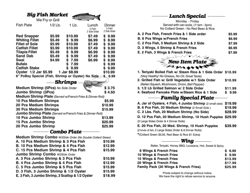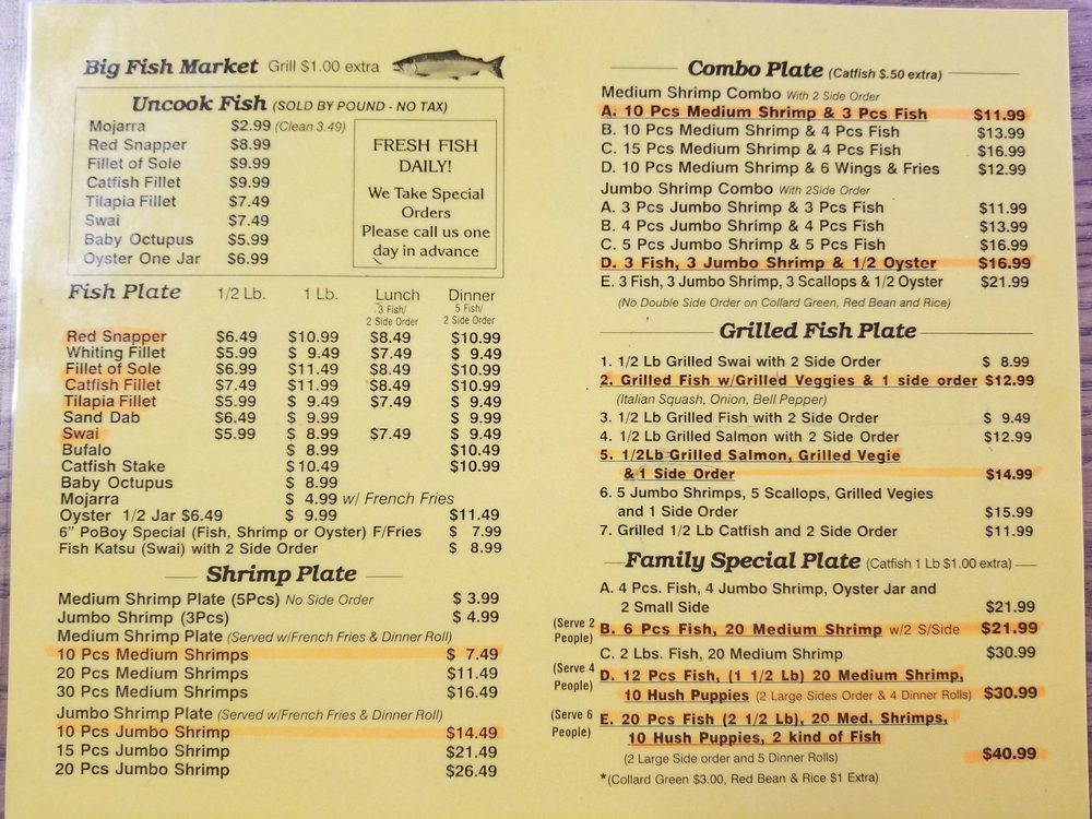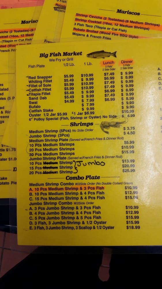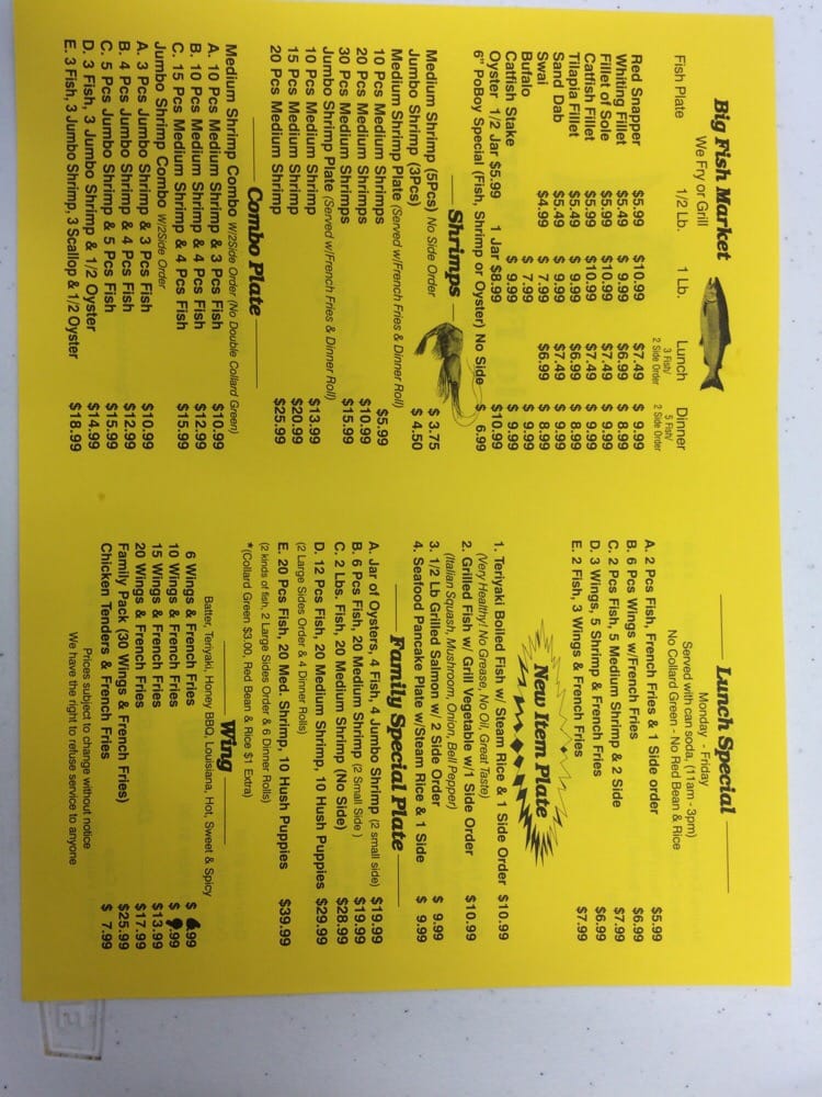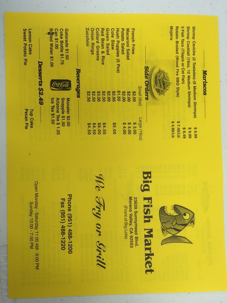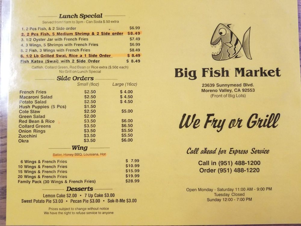 Introducing the menu at Big Fish Market, a seafood restaurant located in Moreno Valley, CA. This casual dining spot offers a wide range of fish plates like Red Snapper, Whiting Fillet, and Tilapia, along with lunch and dinner options. Customers rave about the flavorful and fresh seafood, with favorites like the Catfish Fillet and Shrimp. The menu also includes unique offerings such as Baby Octopus and Oyster plates. With a variety of vegetarian options and happy hour specials, Big Fish Market caters to all tastes. Reviews praise the friendly staff, reasonable prices, and generous portions. Overall, the restaurant provides a solid dining experience with well-prepared, hot dishes that are worth the wait. Don't miss out on the delicious seafood offerings at Big Fish Market.