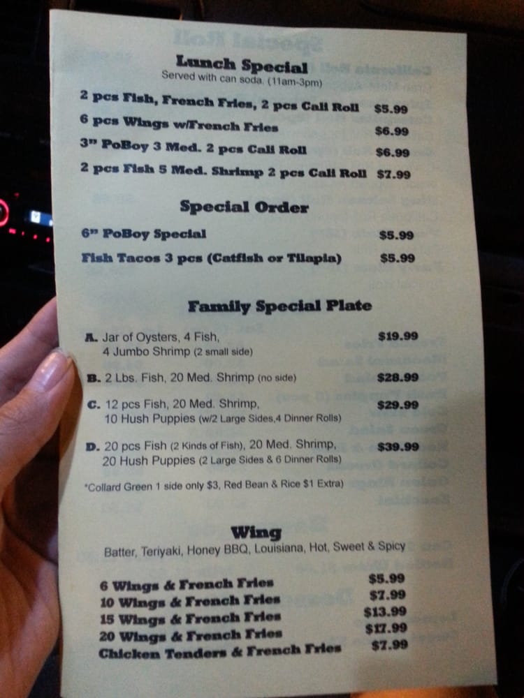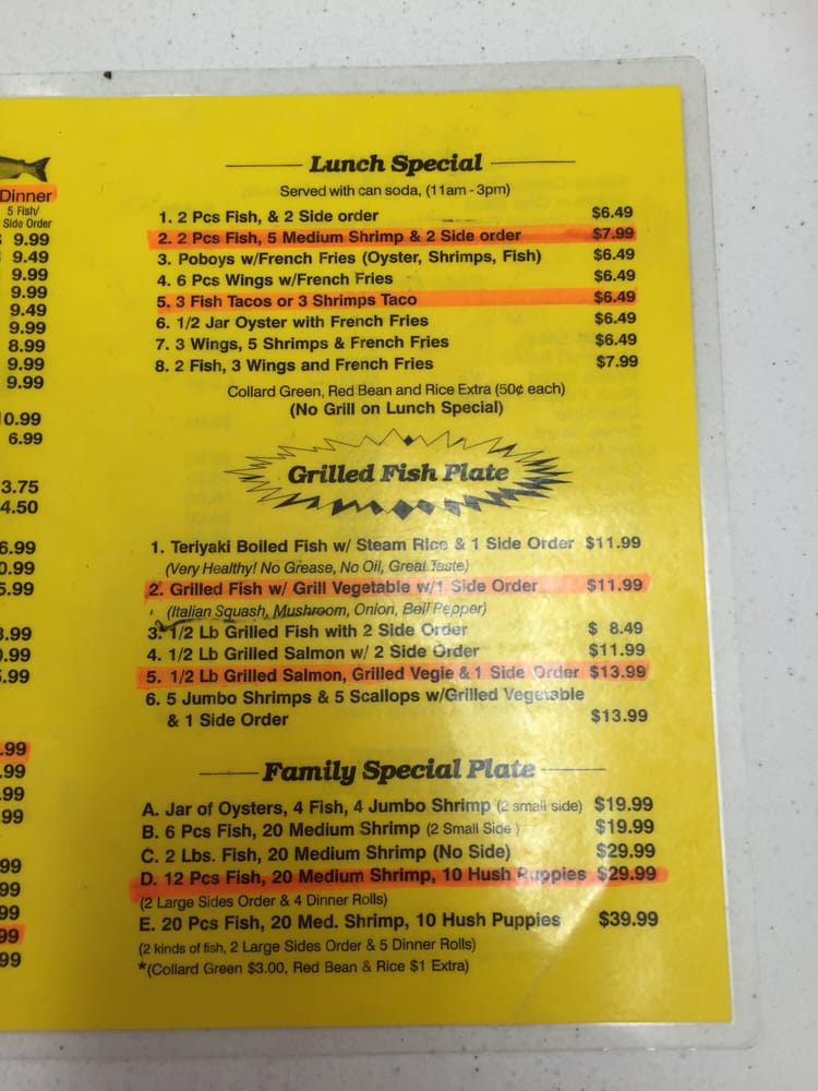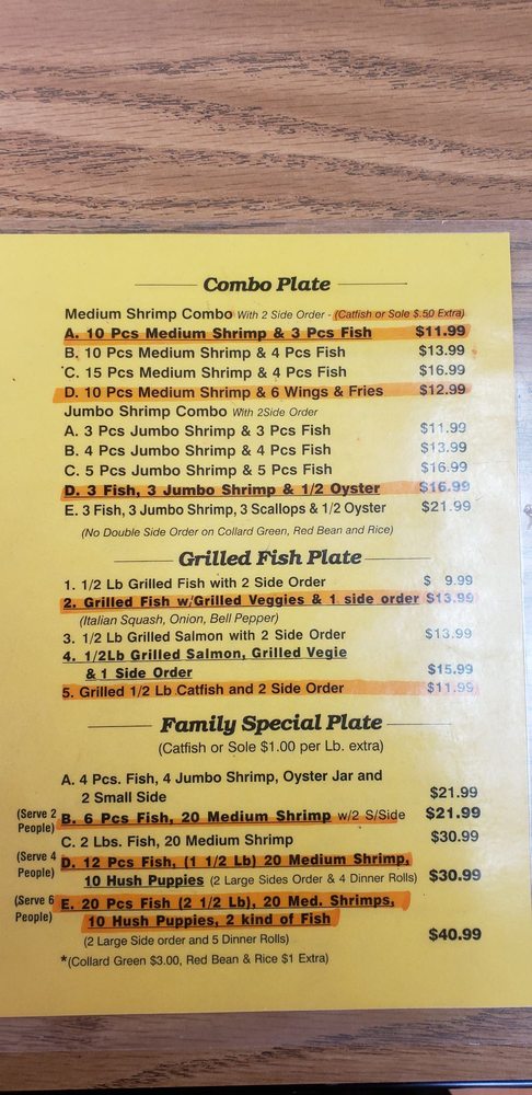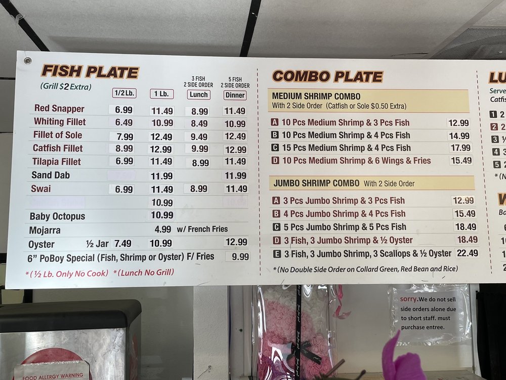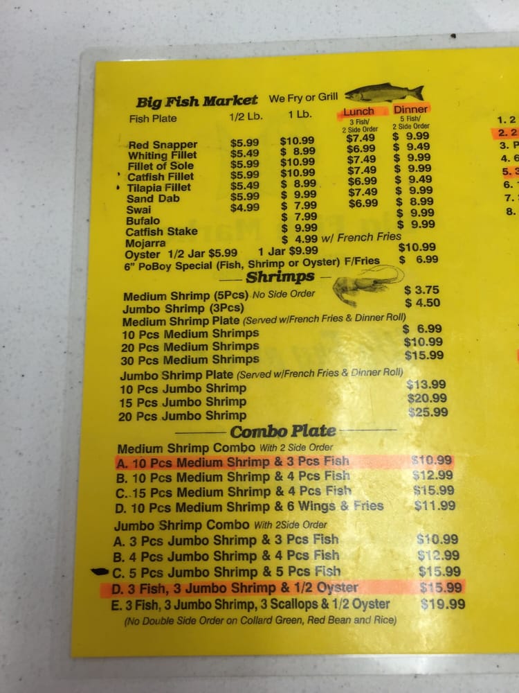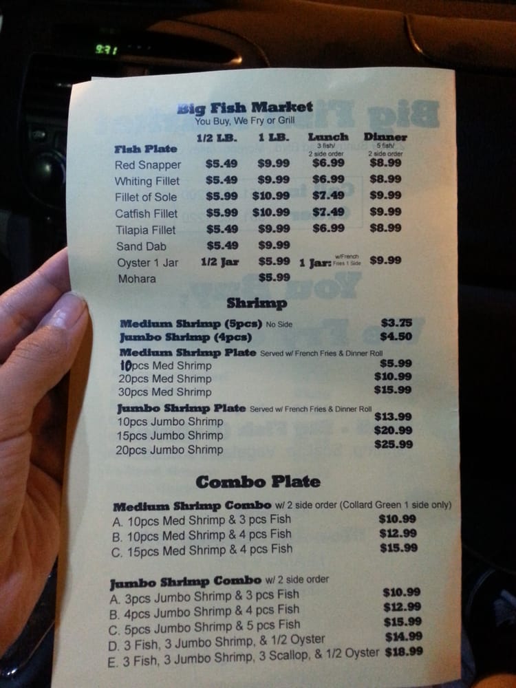 Introducing the menu at Big Fish Market, a seafood restaurant located in Moreno Valley, CA. This casual dining spot offers a wide range of fish plates like Red Snapper, Whiting Fillet, and Tilapia, along with lunch and dinner options. Customers rave about the flavorful and fresh seafood, with favorites like the Catfish Fillet and Shrimp. The menu also includes unique offerings such as Baby Octopus and Oyster plates. With a variety of vegetarian options and happy hour specials, Big Fish Market caters to all tastes. Reviews praise the friendly staff, reasonable prices, and generous portions. Overall, the restaurant provides a solid dining experience with well-prepared, hot dishes that are worth the wait. Don't miss out on the delicious seafood offerings at Big Fish Market.